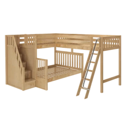 Our corner loft bunk is just that – two beds stacked on one side connected to a single raised bed on the other. The result is a super functional “L” shape that fits perfectly in your bedroom corner.