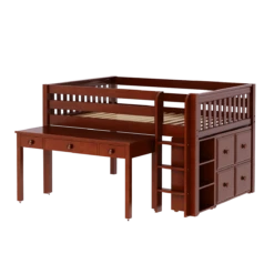 Our low loft with long desk + storage is the ultimate bedroom solution for your creative or studious child! Full size = extra room for growing kids, sleepovers or snuggling.