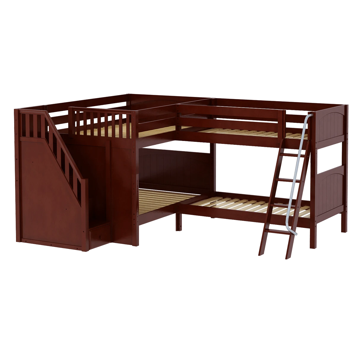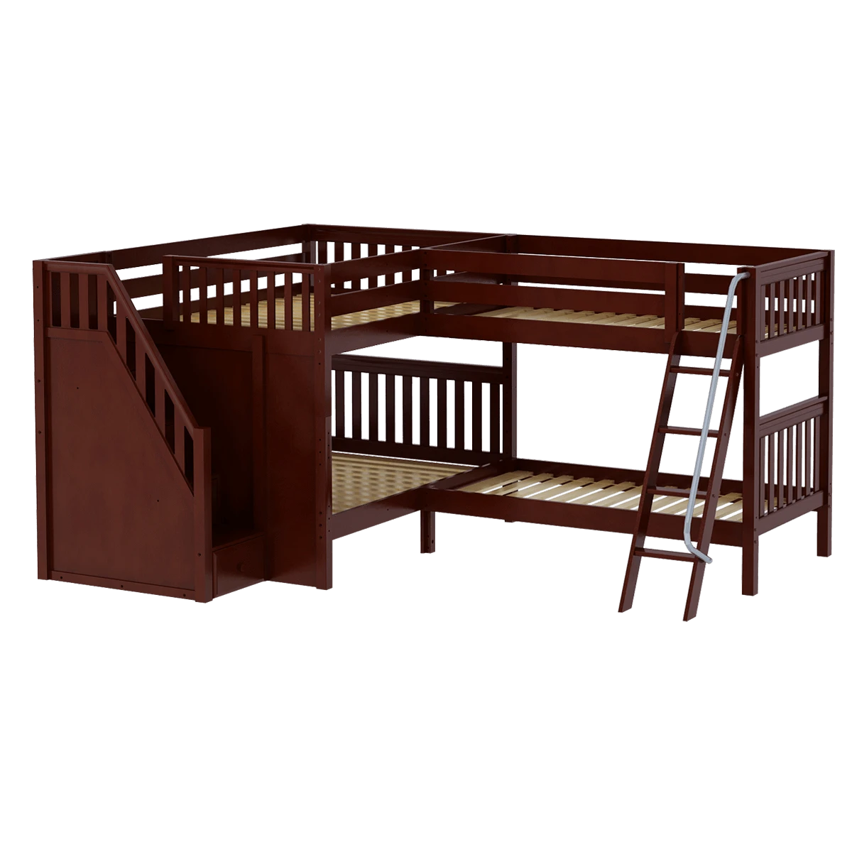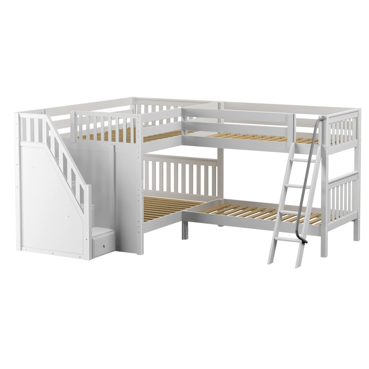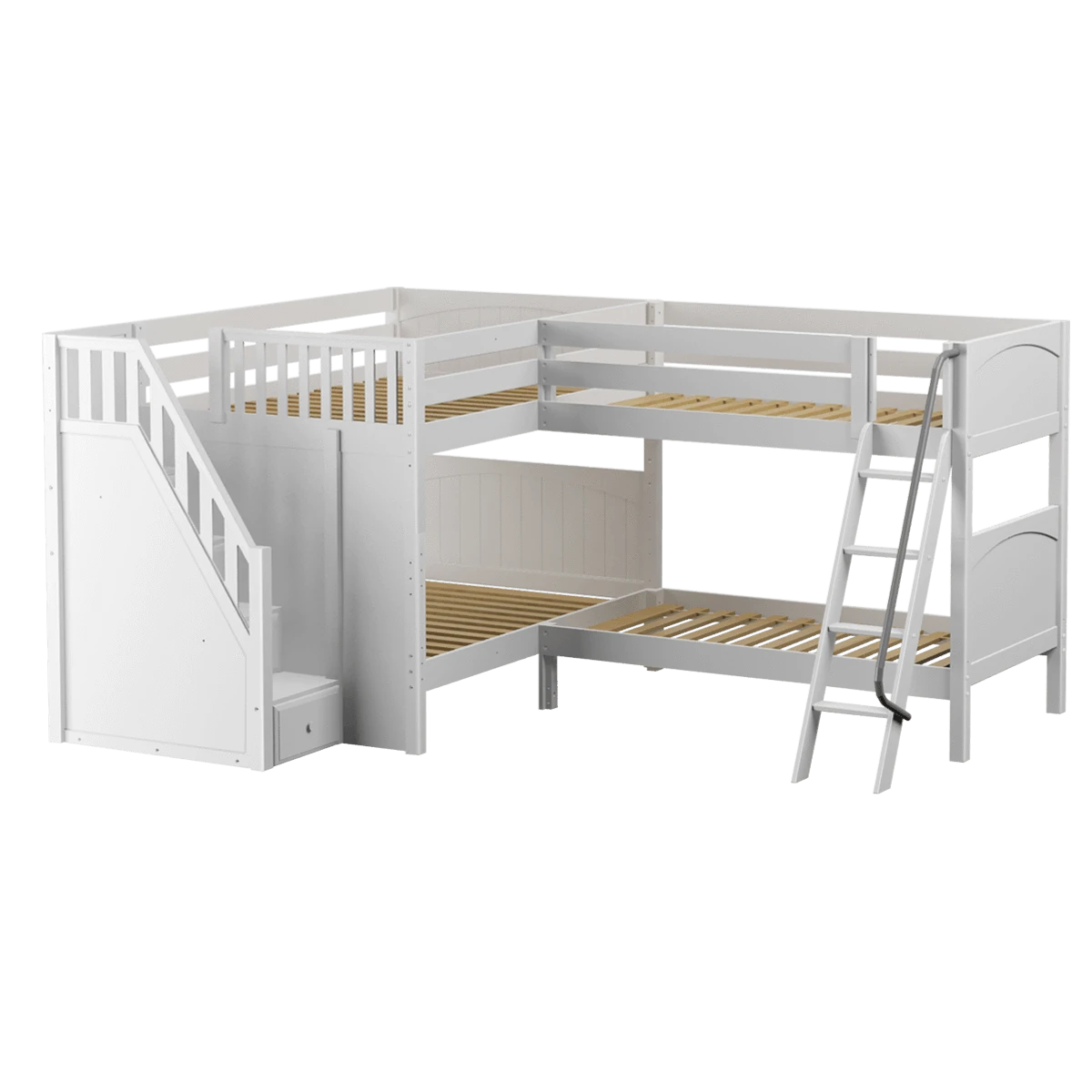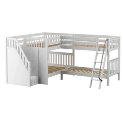 Two bunks connected in an “L” shape that fits perfectly in a bedroom corner. This space-saving design sleeps 4 (or more!) making it the ultimate solution for a shared bedroom or vacation home. Full size bunk with stairs on one side + a twin size bunk with angled ladder on the other. Added bonus, staircase steps double as drawers for built in storage!