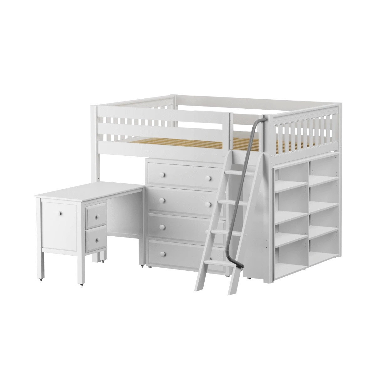 Our mid loft with angled ladder becomes the ultimate storage + study cube! Matching casegoods and desk designed to fit perfectly in the space beneath. Each piece is freestanding, so you can also use separately. Full size = extra room for growing kids, sleepovers or snuggling.