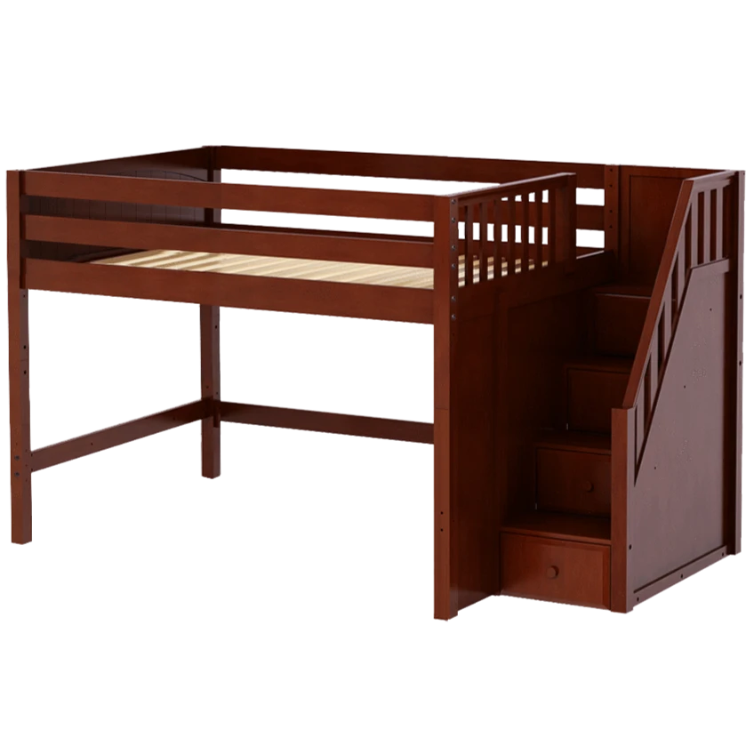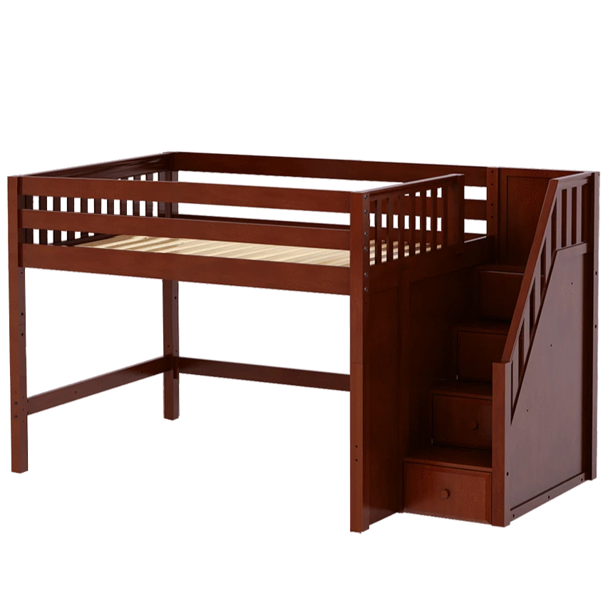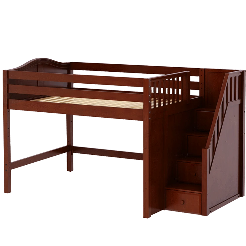 Raised high enough for ample underbed space (10+ inches than the low loft!), but still suitable for younger children and low ceilings, our popular mid loft bed with stairs works for all.