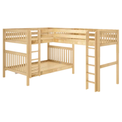 Our high corner loft bunk is just that – two beds stacked on one side connected to a single raised bed on the other. The result is a super functional “L” shape that fits perfectly in your bedroom corner.