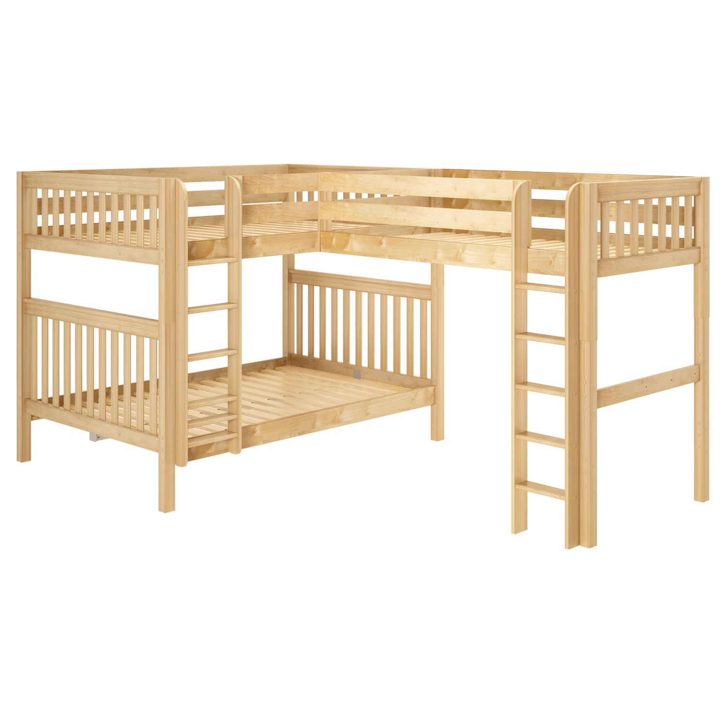 This “L” shaped design fits your bedroom corner for a space-saving way to sleep three! High height = extra headroom between stacked beds and more clearance beneath the loft. Customize free space for storage, study or play. Safe + sturdy ladders on both ends provide dual points of access to top.