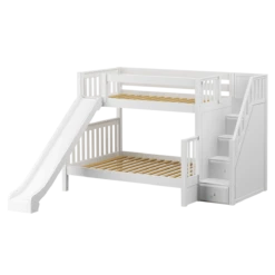 Staircase and slide turn our twin over full bunk bed into the perfect combination of fun + function. Staggered design sleeps different sizes and ages comfortably in one room. Staircase is a safe way for young children to climb into bed, plus each step doubles as a storage drawer.