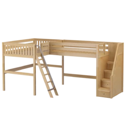 Raised “L” shape fits perfectly in a bedroom corner for a unique way to sleep two. Over 4 ft of underbed clearance – use open floorspace for a desk, storage or leave free for play. Full bed + angled ladder on one side is connected to a twin size bed with stairs on the other. Added bonus, staircase steps double as drawers for built in storage!