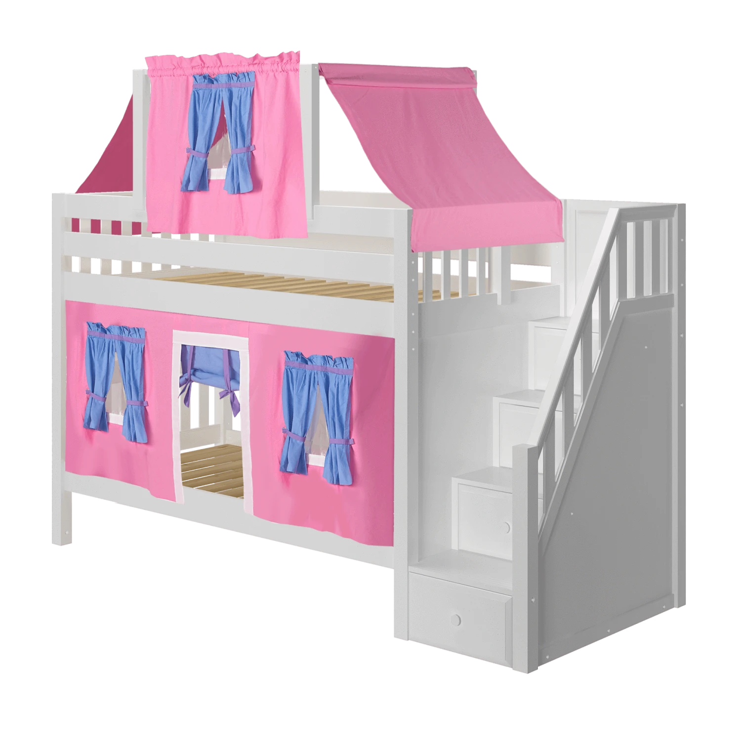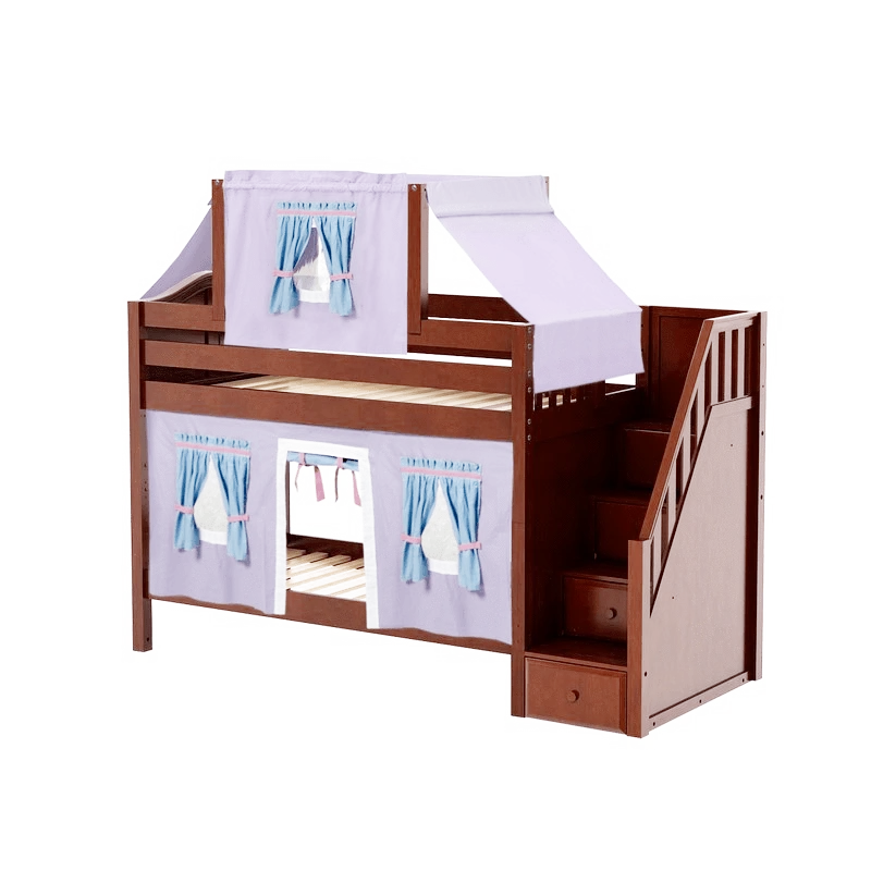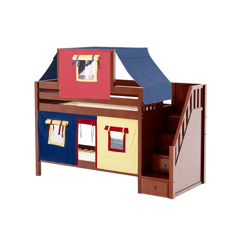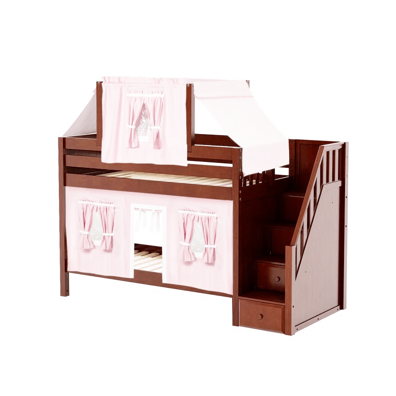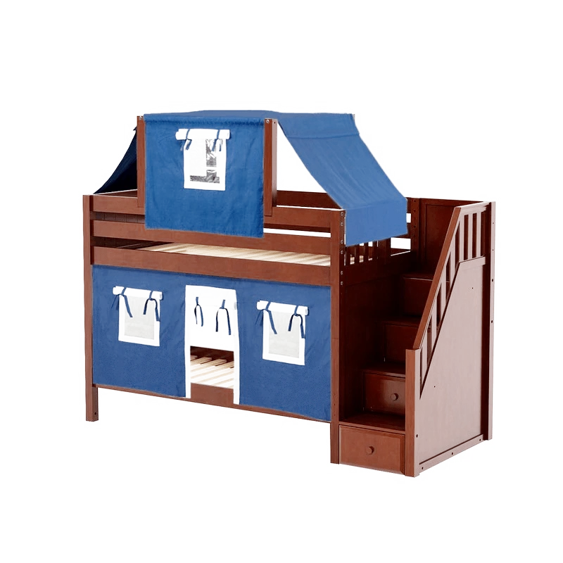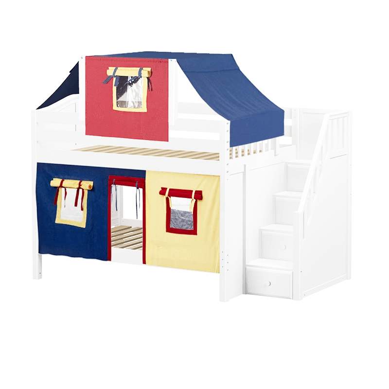 Maxtrix Twin Low Bunk Bed With Stairs, Curtain + Top Tent
