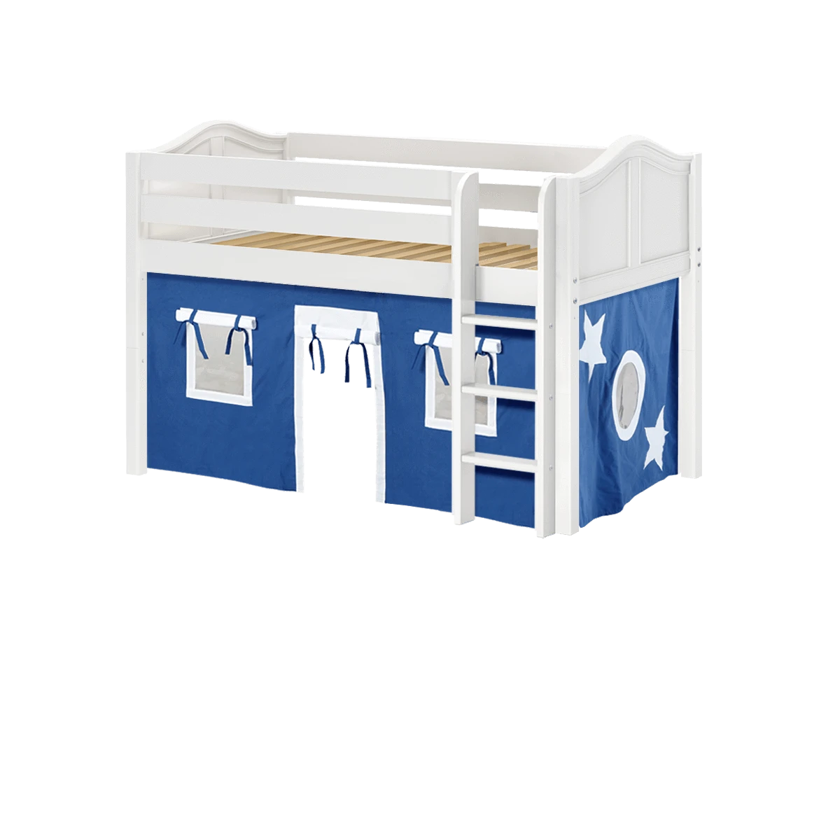 Climb up space-saving, solid wood straight ladder with extra wide, grooved steps. Only 50.75” high, this low loft bed is suitable for rooms with low ceilings (8 feet and lower) and smaller spaces.