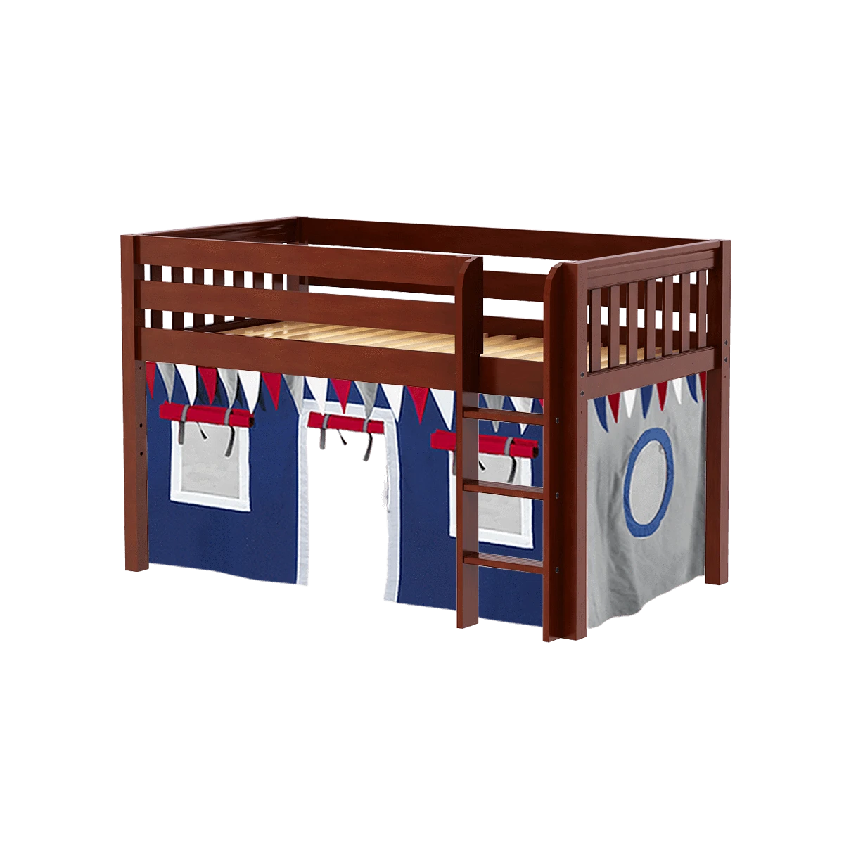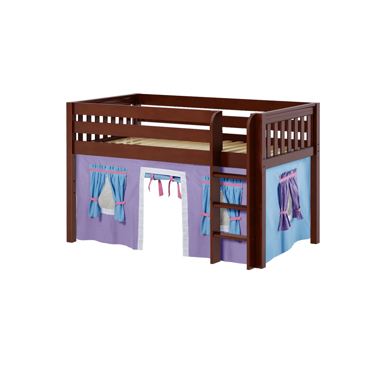 Kids love sleeping up high, parents think safety first. We created a twin size junior loft bed with straight ladder that works for both. Colorful underbed curtains add an element of indoor fun!