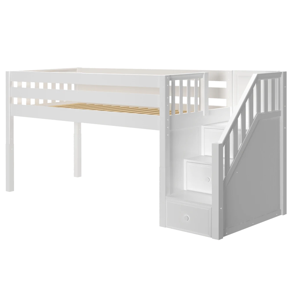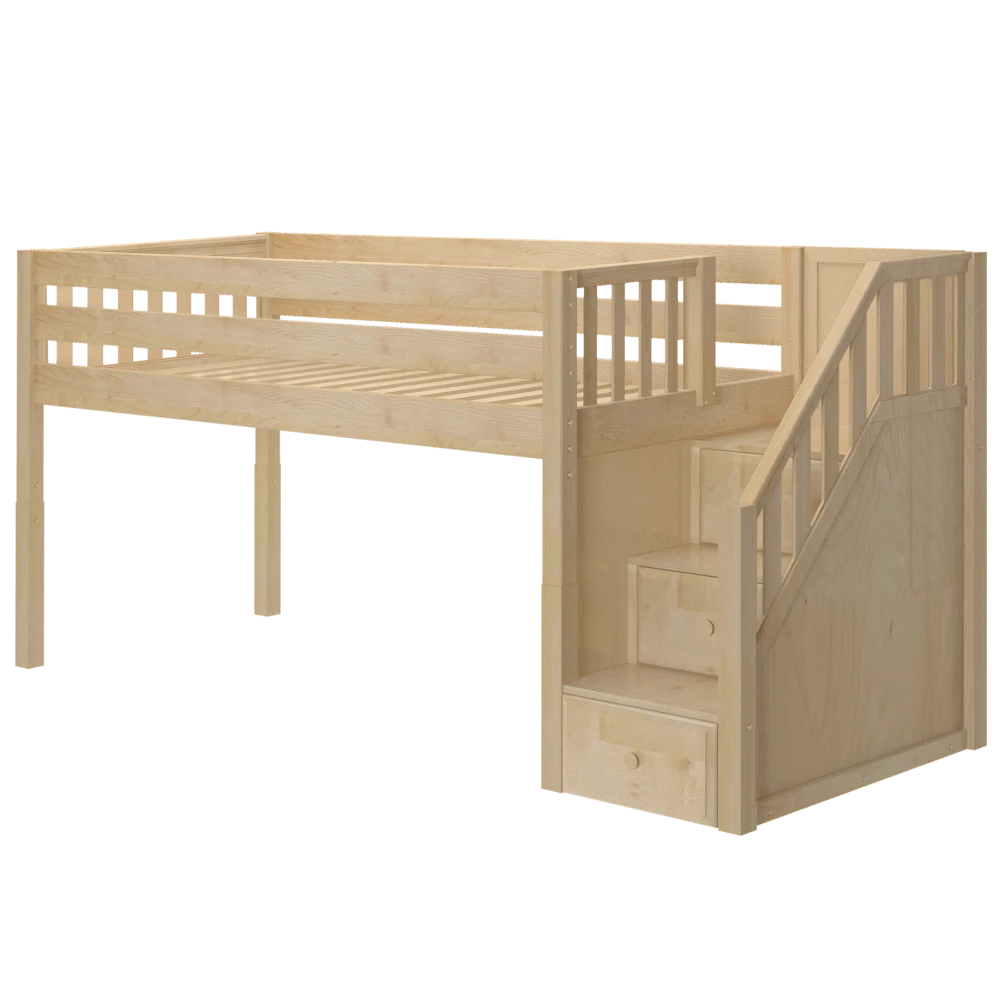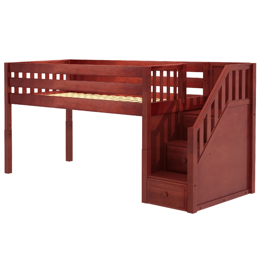 Our best-selling low loft bed with stairs is now offered in extra-long to accommodate longer legs! Twin XL loft bed = standard twin width (42.5”) + additional 4” length (84”). Requires Twin XL mattress.