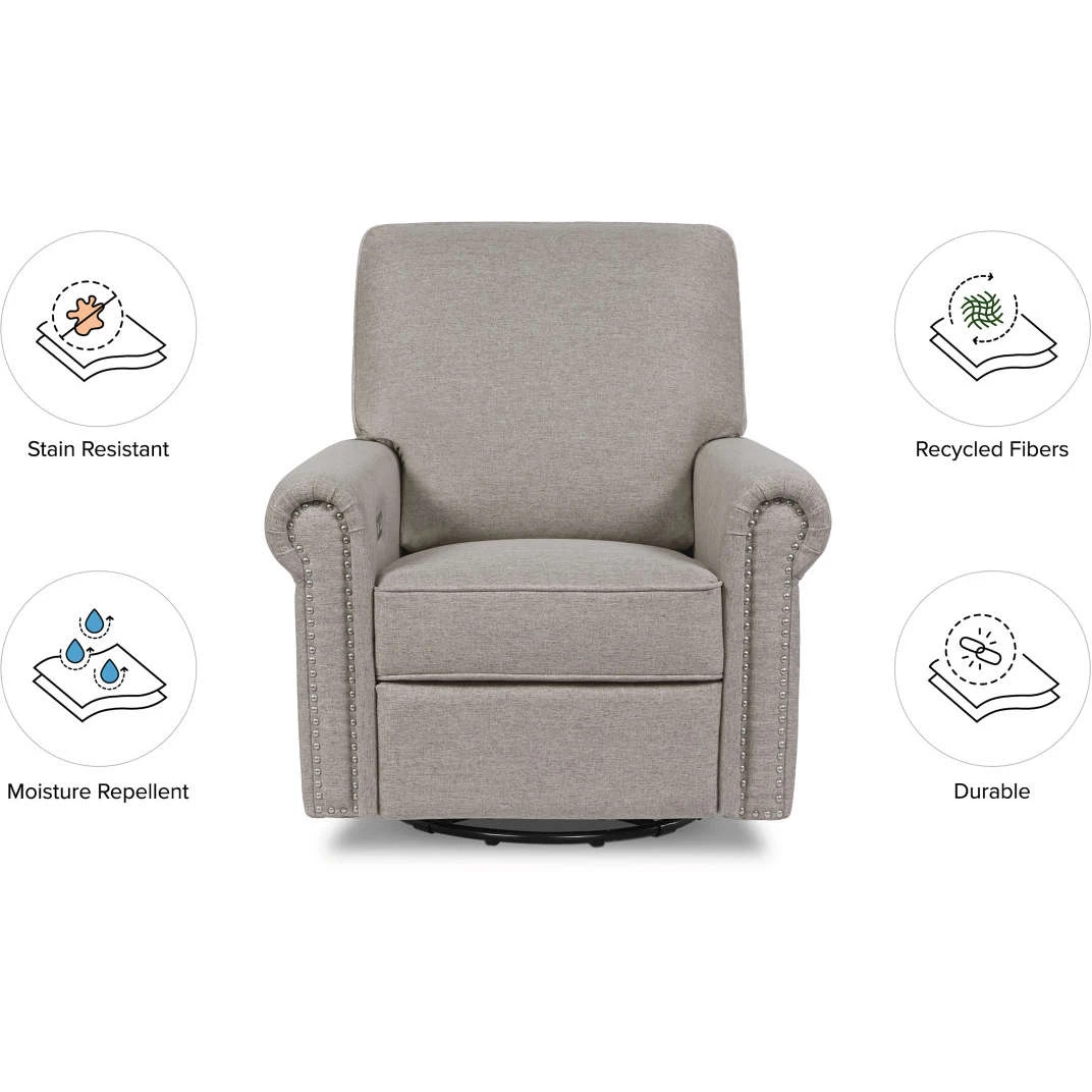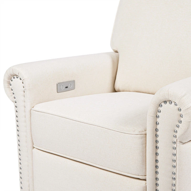 The Linden Power Recliner blends comfort, convenience, and style in your nursery space. With a soft pillowback and cozy armrests, the chair provides a space to unwind throughout the day, while the elegant nail head details add a thoughtful touch to its classic silhouette. The Linden’s electronic reclining mechanism allows you to relax at the push of a button and its USB port keeps you charged while you rest with your baby. With a back-and-forth swivel and 360-degree glide, you can rock your baby to sleep with ease.